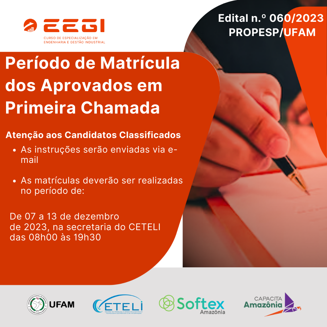 Aos aprovados em primeira chamada, do Curso de Especialização em Engenharia e Gestão Industrial / Edital Nº 060, 2023 - PROPESP/UFAM, o CETELI informa que o período de matrícula está aberto do dia 07 a 13 de dezembro de 2023.